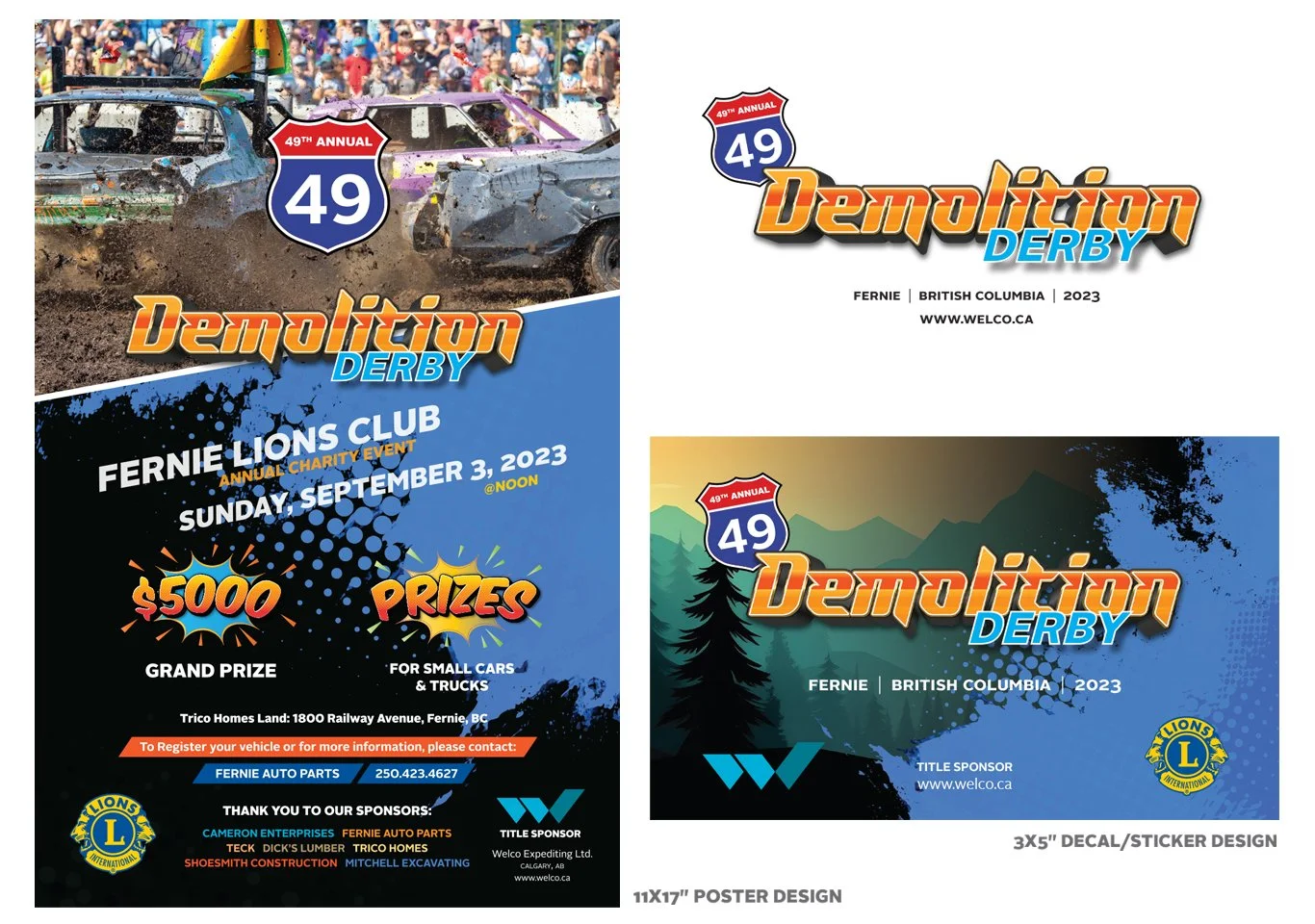 49th Annual Fernie Demolition Derby 2023 Designs – 11x17” Poster / 3x5” Decal / Logo Branding